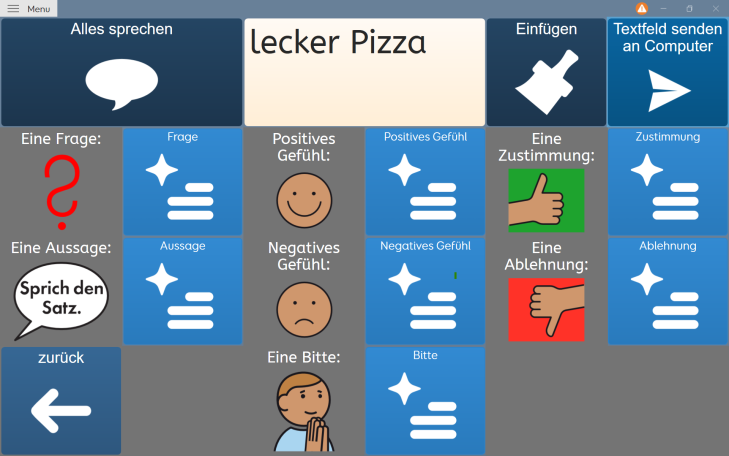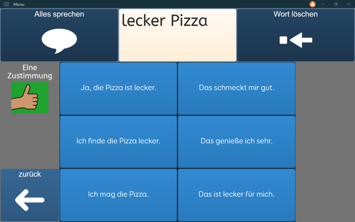 Beispielwörter sind "Lecker" und "Pizza". Einmal wurden daraus zustimmende Aussagen und einmal ablehnende Aussagen erstellt. Die Klient:in kann sich die Vorschläge vorlesen lassen und dann auswählen.