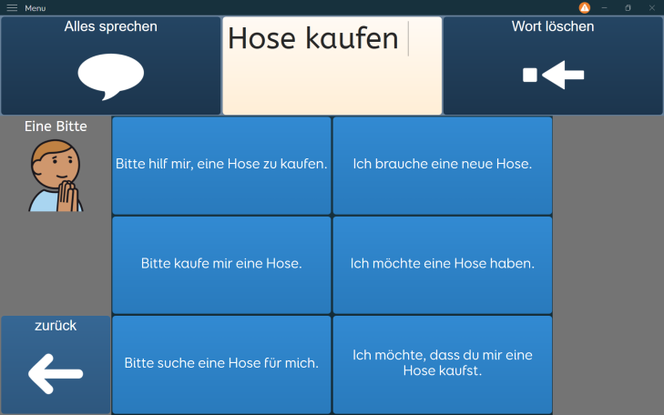 Beispielwörter sind "Hose" und "kaufen". Einmal wurden daraus Bitten und einmal Fragen erstellt. Die Klient:in kann sich die Vorschläge vorlesen lassen und dann auswählen.